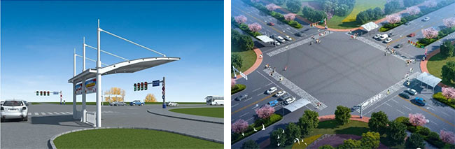 本次四座遮陽擋雨棚采用了無礙交通的設(shè)計,占地面積小,不阻礙視野,通透感十足,在保證美觀的同時,更加堅實牢固,也增強(qiáng)了市民朋友的視覺安全性。每個遮陽擋雨棚還設(shè)置廣告宣傳燈箱,一方面可以更好的宣傳鹽城經(jīng)開區(qū)的文明創(chuàng)建工作,讓創(chuàng)建更加深入人心;另一方面方便群眾過馬路在等候放行信號時免受日曬雨淋,便于安心等候,讓過往市民感受到城市的人文關(guān)懷。